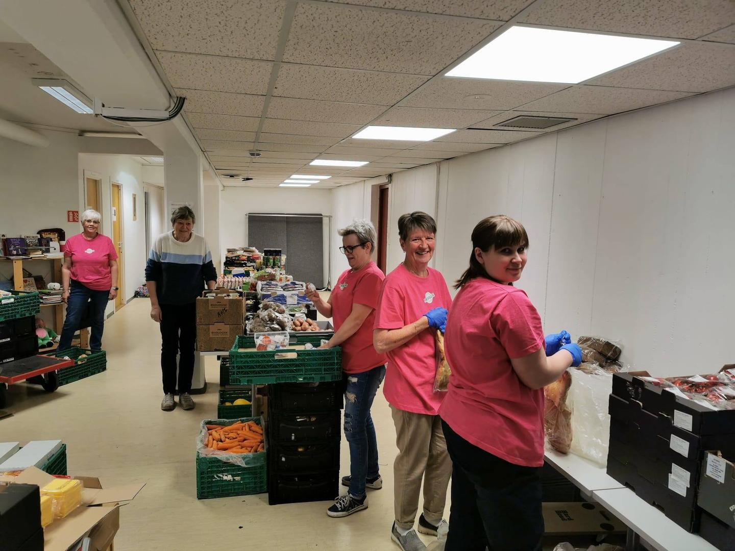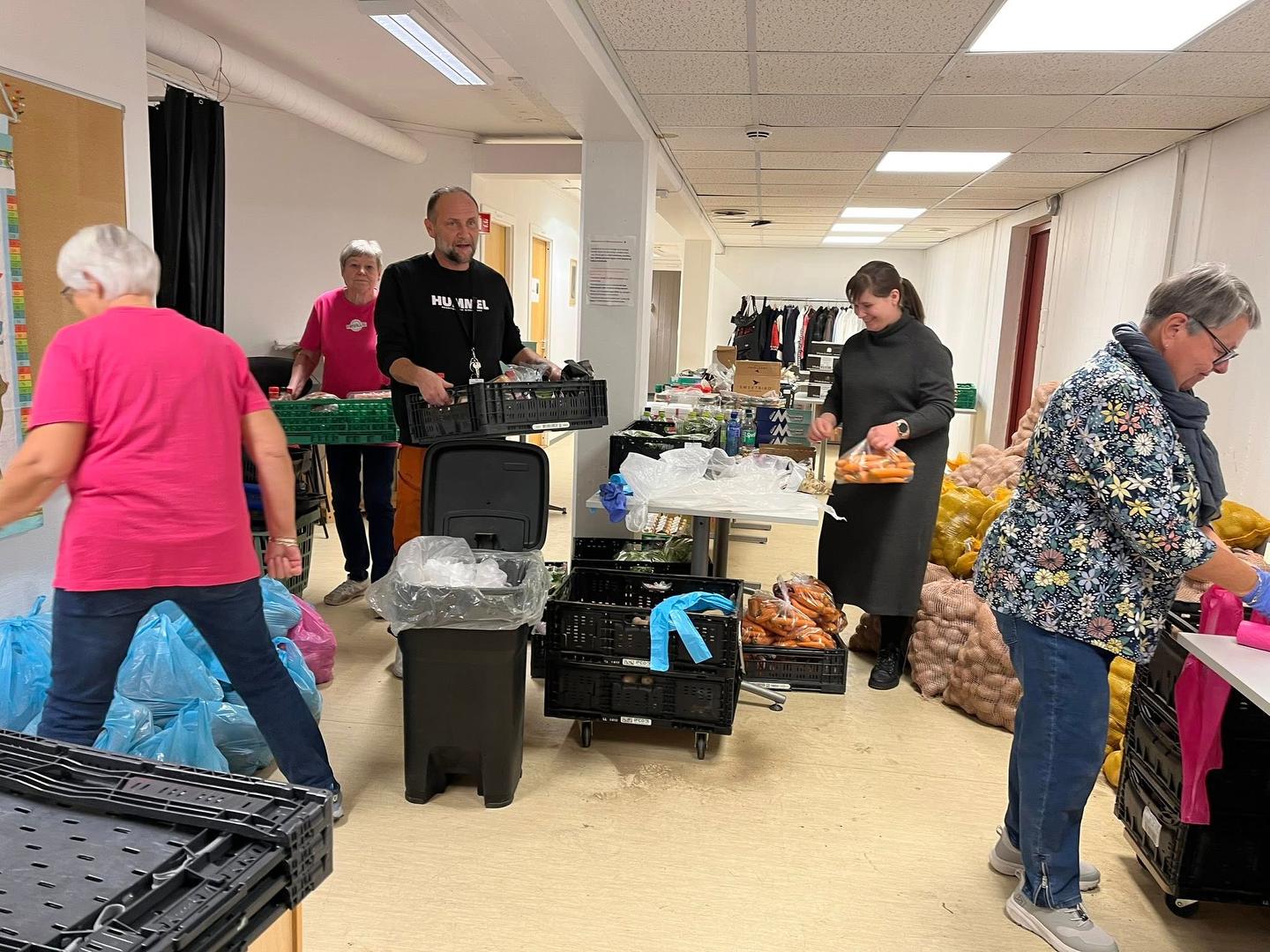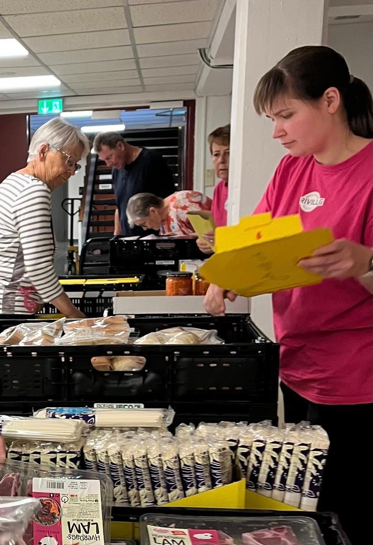 Klær, forbruksvarer og mat deles ut fra lokaler i rådhuskjelleren. I samarbeid med Matsentralen Oslo ble det hentet mat ukentlig, og over 460 personer fra 180 husstander har mottatt mat i løpet av våren. Vi opplevde dessverre å ha for lite mat for å dekke behovet, og tidvis lite forståelse og respekt for at maten skal fordeles likt til alle. Vi opplevde også at ikke alle som stod på lista trengte det i like stor grad som andre. Vi evaluerte tilbudet høsten 2025, og gikk over til kun hjemkjøring og ny registrering der hver husstand ble sjekket nøyere i forhold til behov og ytelser.